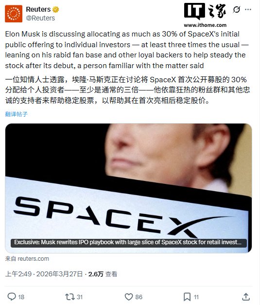 IT之家 3 月 27 日消息,据路透社今日报道,马斯克正考虑在 SpaceX 的首次公开募股中,将高达 30% 的份额分配给个人投资者。